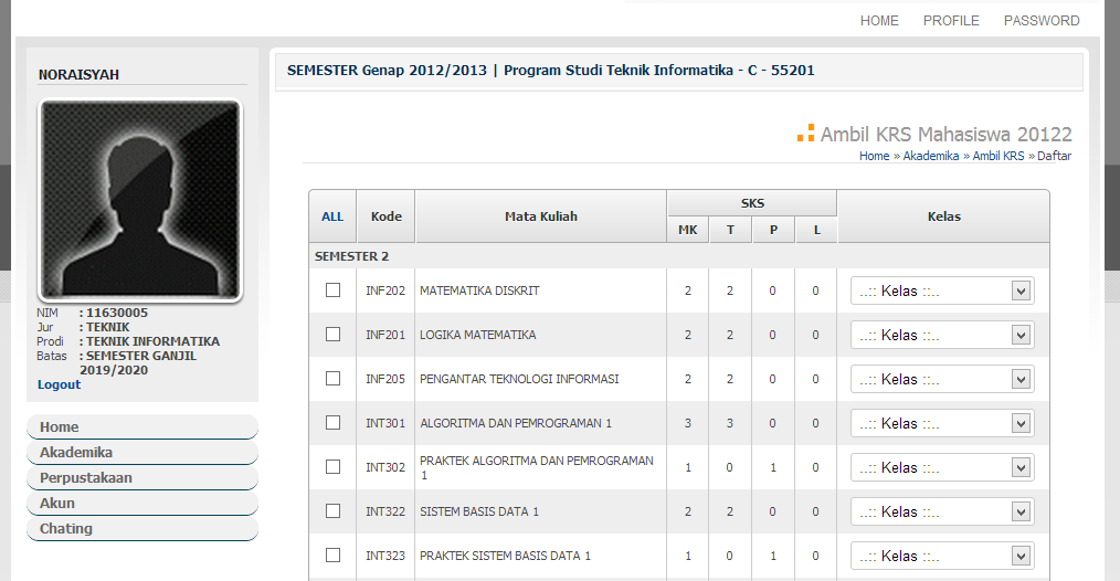 1. Pilih menu Akademika >> "KRS" >> "Ambil KRS" di menubar, kemudian akan tampil page seperti di atas.