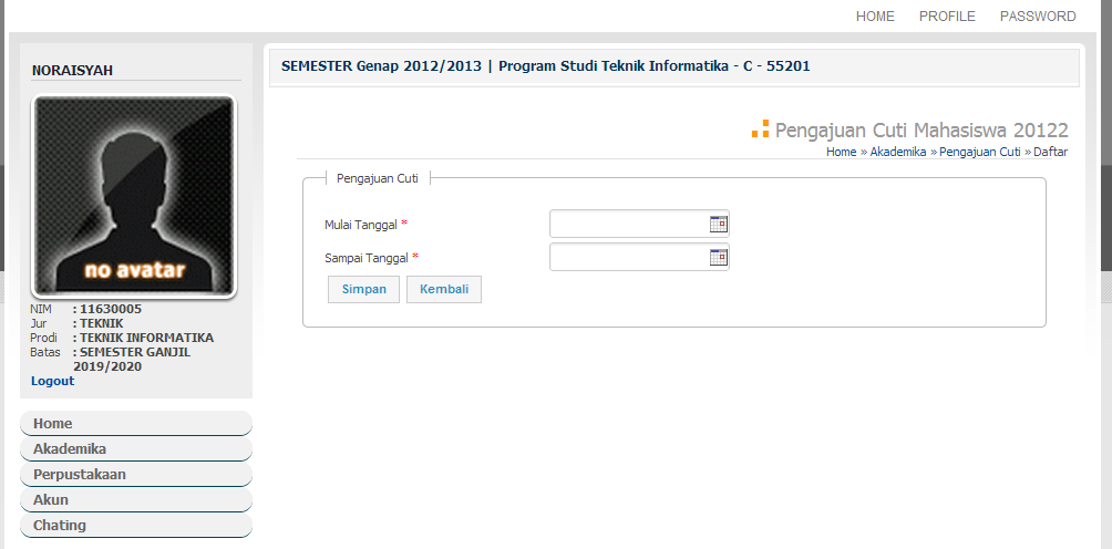 1. Pilih menu Akademika >> "Pengajuan Cuti" untuk mengajukan cuti.