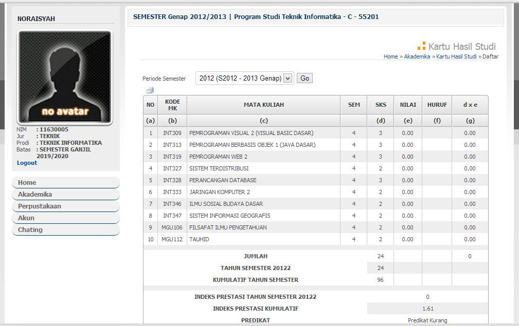 1. Pilih menu Akademika >> "Nilai" >> "Kartu Hasil Studi" di menubar, kemudian akan tampil page seperti di atas.