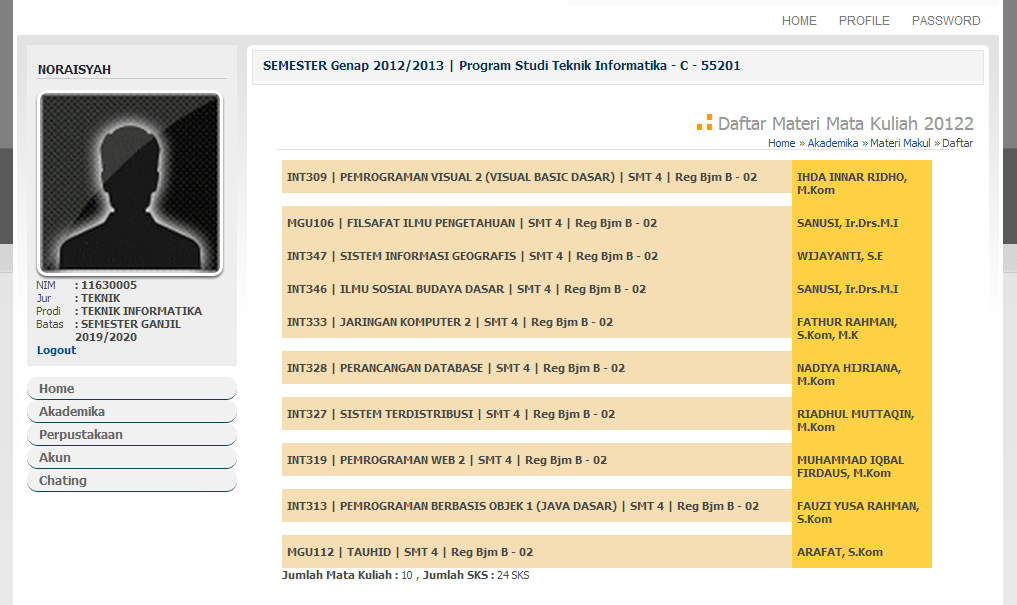 1. Pilih menu Akademika >> "Mata Kuliah" >> "Materi Makul" melihat bahan ajar digital mata kuliah.