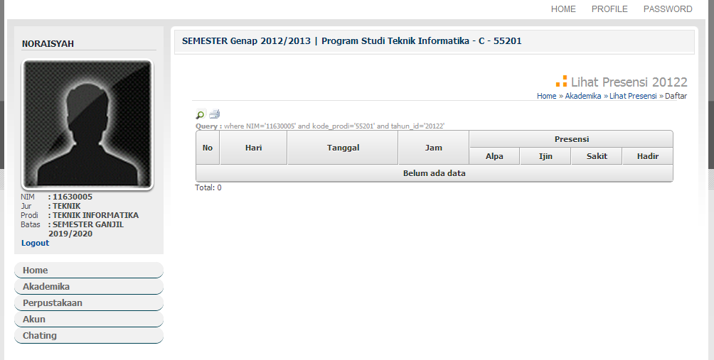 1. Pilih menu Akademika >> Presensi >> Lihat Presensi untuk melihat dan mencetak presensi kehadiran mahasiswa