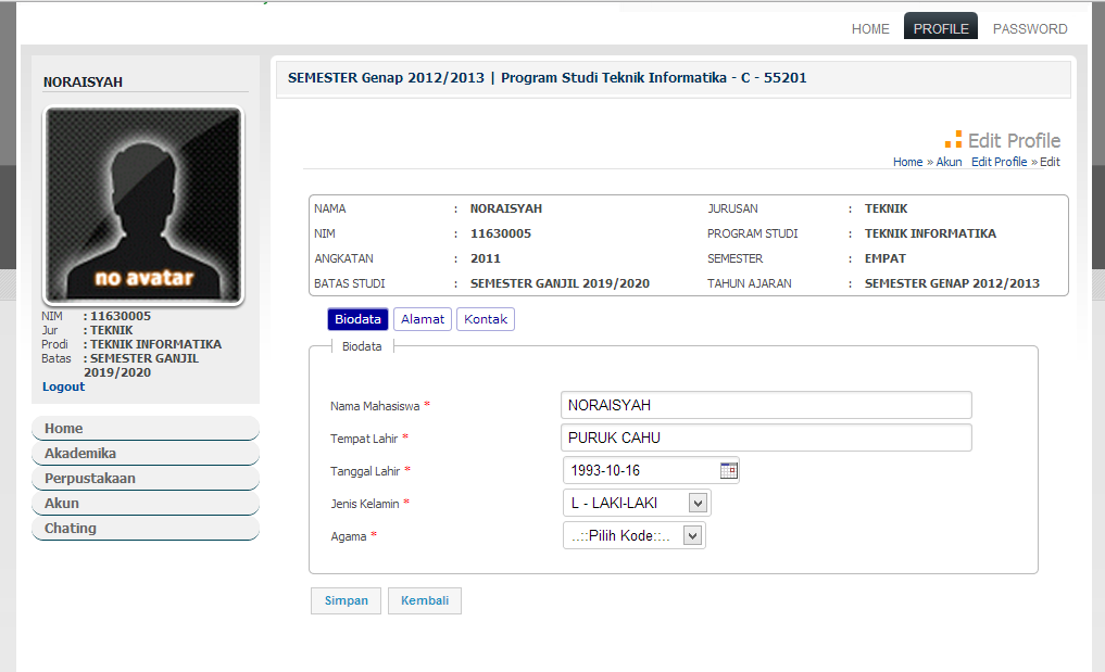 1. Pilih menu Akun >> Edit Profile untuk merubah profil mahasiswa