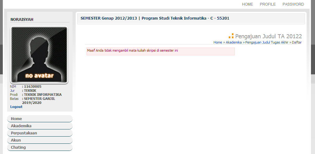 1. Pilih menu Akademika >> "Pengajuan Judul TA" di menubar, kemudian akan tampil page seperti di atas.